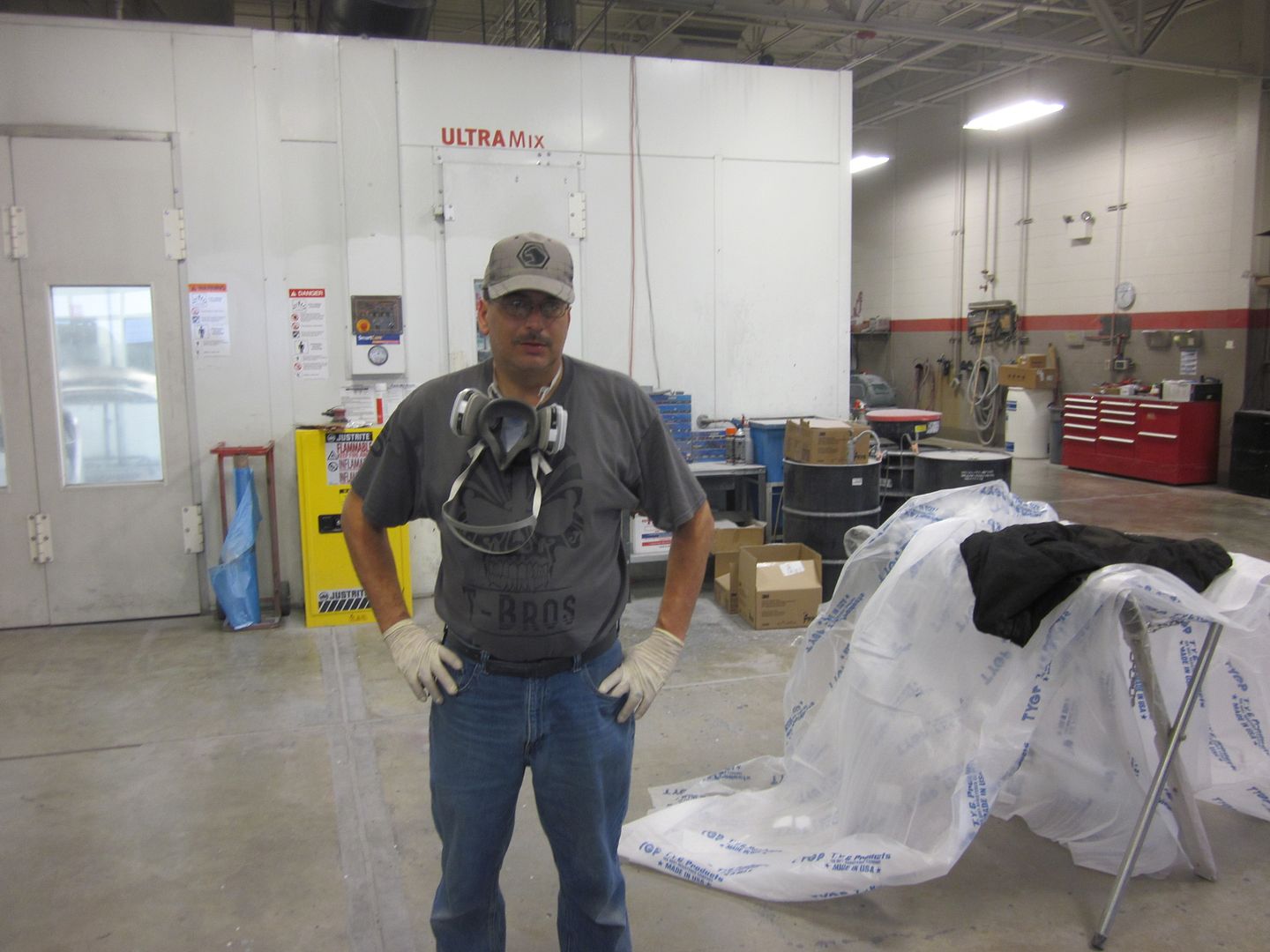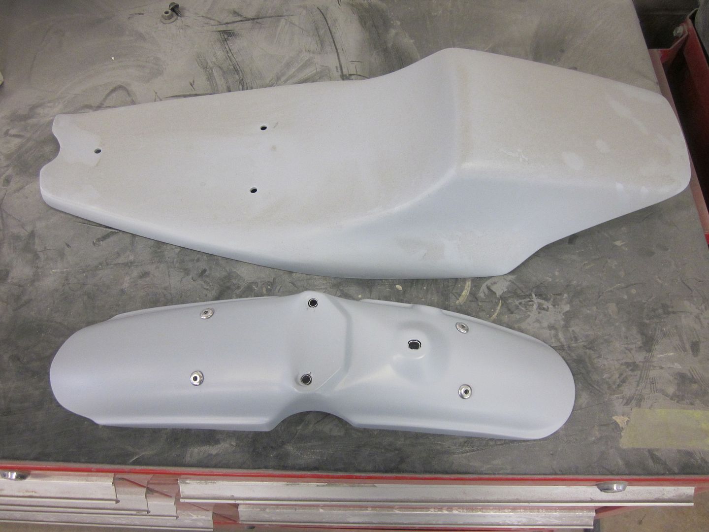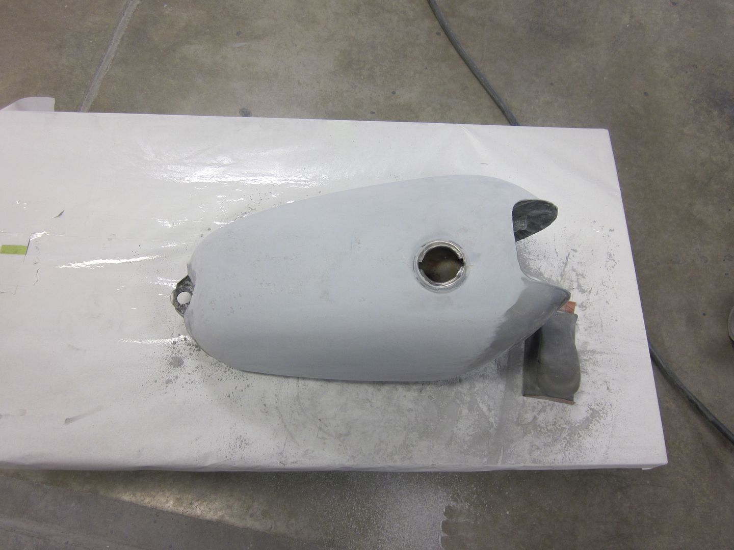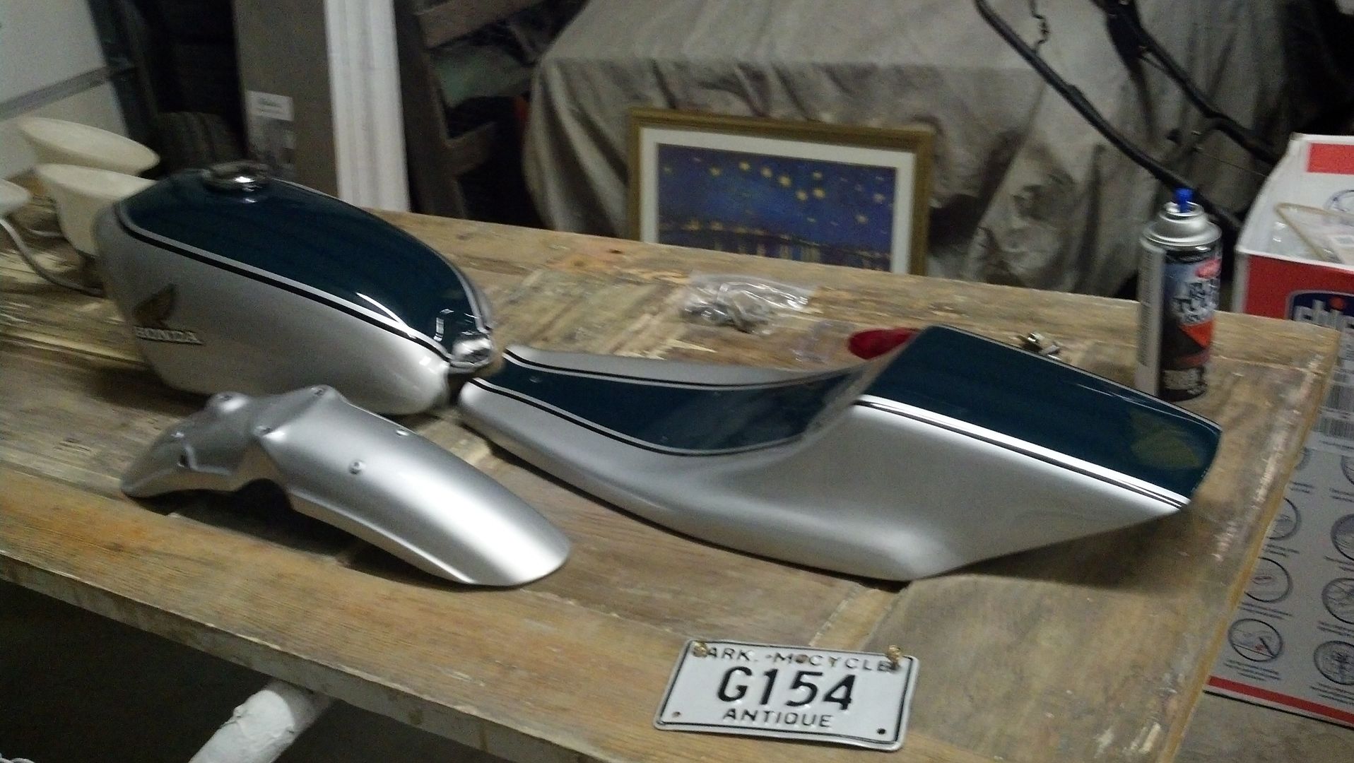 Hello, it's been awhile since I sent anything so this is some of what happened. With the bike running okay I decided to get after the cracked and tattered body parts. The only thing that was not in need was the seat. The seatpan/rear fender was lengthened to fit the bike better, the tank stripped and straightened, trash heap front fender stripped and repaired, and some structure made for the seat. The seat was just kind of stuck on there in such a way that there was an unintentional spring ride effect that was destroying the fiberglass in a hurry. There was also no taillight or tag mount of any kind. The frame had been hastily hacked and the previous owner who did it definitely didn't have my plans in mind. Probably the same guy who cut off the kickstand so the cool muffler would fit. The paint spray is the only part I didn't personally handle and it was done by Rick Thurstenson- the dude in the pic. His work is fantastic! Anyhow, reassembly revealed all